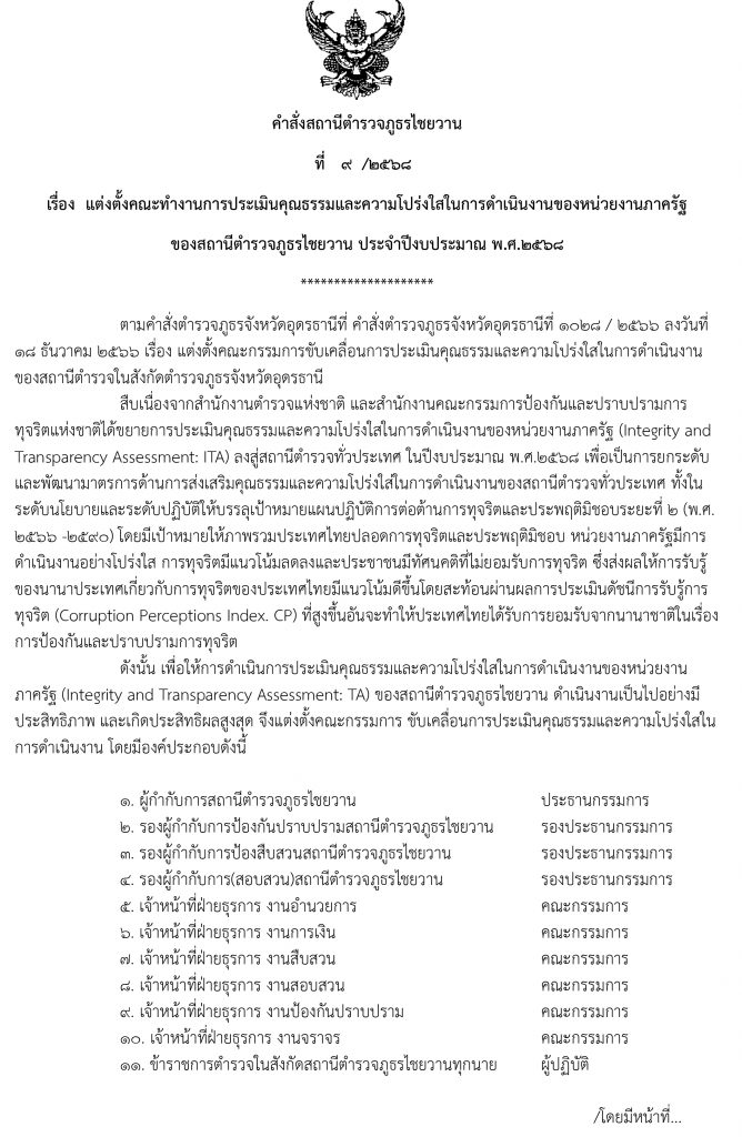 วันที่ 26 พ.ย. 2567 พ.ต.อ.รัฐพลชัย เพ็ญสงคราม ผกก.สภ.ไชยวาน ได้ดำเนินการประชุมการขับเคลื่อนการประเมินคุณธรรม และ ความโปร่งใสในการดำเนินงานของหน่วยงานภาครัฐ (Integrity and Transparency Assessment: ITA) ของสถานีตำรวจประจำปีงบประมาณ พ.ศ.๒๕๖๘ ซึ่งการประชุมดังกล่าว มีวัตถุประสงค์ เพื่อแจ้งคำสั่งแต่งตั้งคณะกรรมการขับเคลื่อนการประเมิน คุณธรรมและความโปร่งใสในการดำเนินงานของสถานีตำรวจภูธรไชยวาน ให้ผู้ใต้บังคับบัญชา รับทราบและถือปฏิบัติ